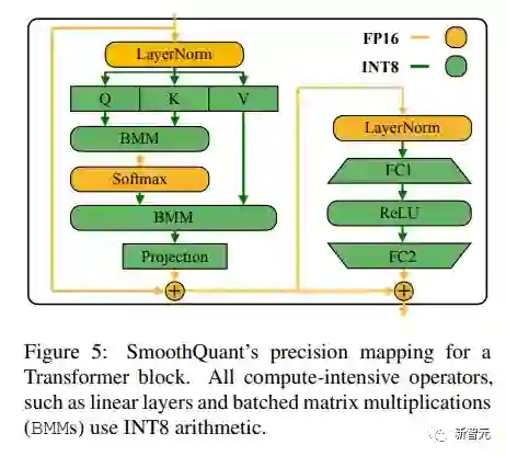 线性层占据了LLM模型的大部分参数和计算。在默认情况下,SmoothQuant对Transformer中所有线性层的输入激活进行比例平滑,并用W8A8对线性层进行量化,在注意力计算中启用了BMM运算符的量化。