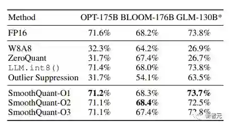 尽管如此,SmoothQuant-O1可以与FP16的准确性相匹配,而SmoothQuant-O3只降低了1%的准确性,明显优于基线。