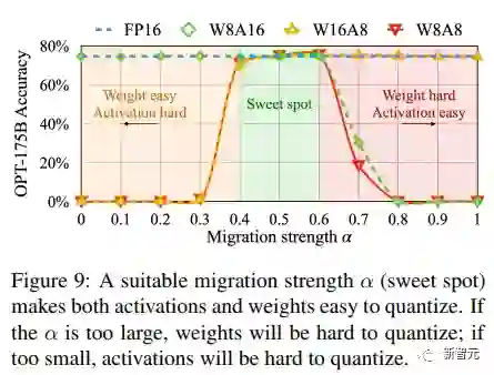 对于其他一些激活异常值比较大的模型,例如GLM-130B有30%的异常值,这对激活量化来说比较困难,可以选择一个较大的α(如0.75),将更多的量化难度迁移到权重上。