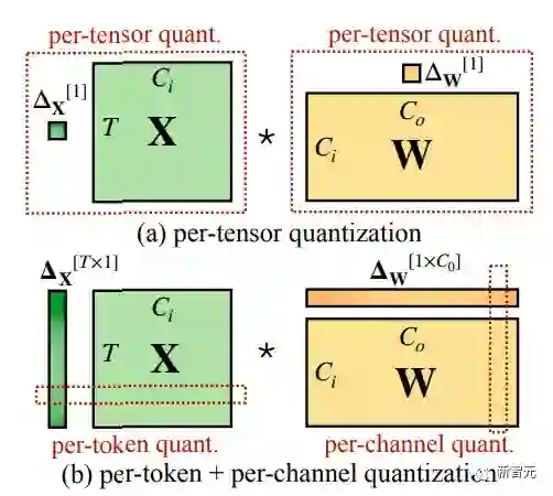 量化操作可以在不同的粒度上执行,如per-tensor量化应用于整个权重矩阵,per-token量化应用于激活中的每个token,per-channel量化应用于权重的每个输出通道。