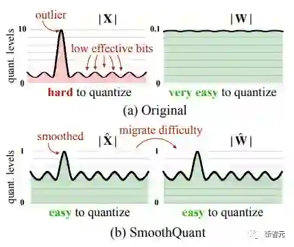 最近,麻省理工学院和英伟达的研究人员联合提出了一个通用后训练的量化(GPQ, general-purpose post-training quantization)方案SmoothQuant,对大型语言模型可以高效实现8-bit权重,8-bit激活(W8A8)的量化,无需训练也能保持模型的准确率。
