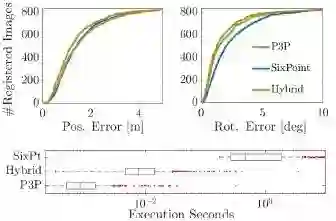 该论文通过结合了2D-3D点对以及2D-2D点对的运动恢复结构模型(SFM)来解决针孔和广义相机标定中的位姿估计问题。传统对相机位姿的估计方法要么是基于模型的,即利用2D-3D匹配的方法,要么仅利用2D-2D匹配(无模型的位姿估计)。绝对位姿方法的性能受限于3D点三角剖分的质量以及3D模型完备性。另一方面,相对位姿方法在精度上更高,但往往更昂贵,且往往会得到几十种可能的结果。该论文旨在弥合上述两种方法之间的鸿沟。 该论文提出了一种新的基于RANSAC的方法,它可以自动选择最佳类型的求解器,以在数据流中的每次迭代中使用。基于该论文提出的RANSAC选择的求解器可以覆盖纯粹的基于模型的或无模型的求解器到任何组合可能获得的混合求解器(即使用两种类型的组合)。同时,该论文介绍了一些新的混合最小求解器。基于合成和真实数据的实验表明,该论文提出的方法的准确率和无模型的方法一样,同时其的处理效率接近于基于模型的方法。
