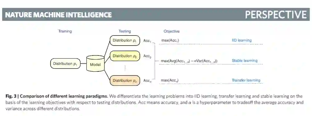 稳定学习无需测试数据集与训练数据来自同一分布,并且不假设测试数据分布已知。测试目标是在保证模型平均准确度的前提下,降低模型性能在各种不同样本分布下的准确率方差。与上述学习模式相比,稳定学习的目标更接近现实的问题设置,理论上,稳定学习可以在不同分布的测试集下都有较好的性能表现。
