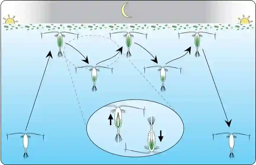 磷虾的食物是更为微小的海洋浮游动物。对于浮游动物来说,它们的食物则是生活在光照充足的浅海中的浮游植物,但如果在白天贸然来到浅海捕食,就不可避免地会将自己置身于捕食性动物的眼前。漆黑一片的夜晚,显然是更为安全的掩护。于是,浮游动物会在夜间上浮捕食,白昼则潜入深水蛰伏。
