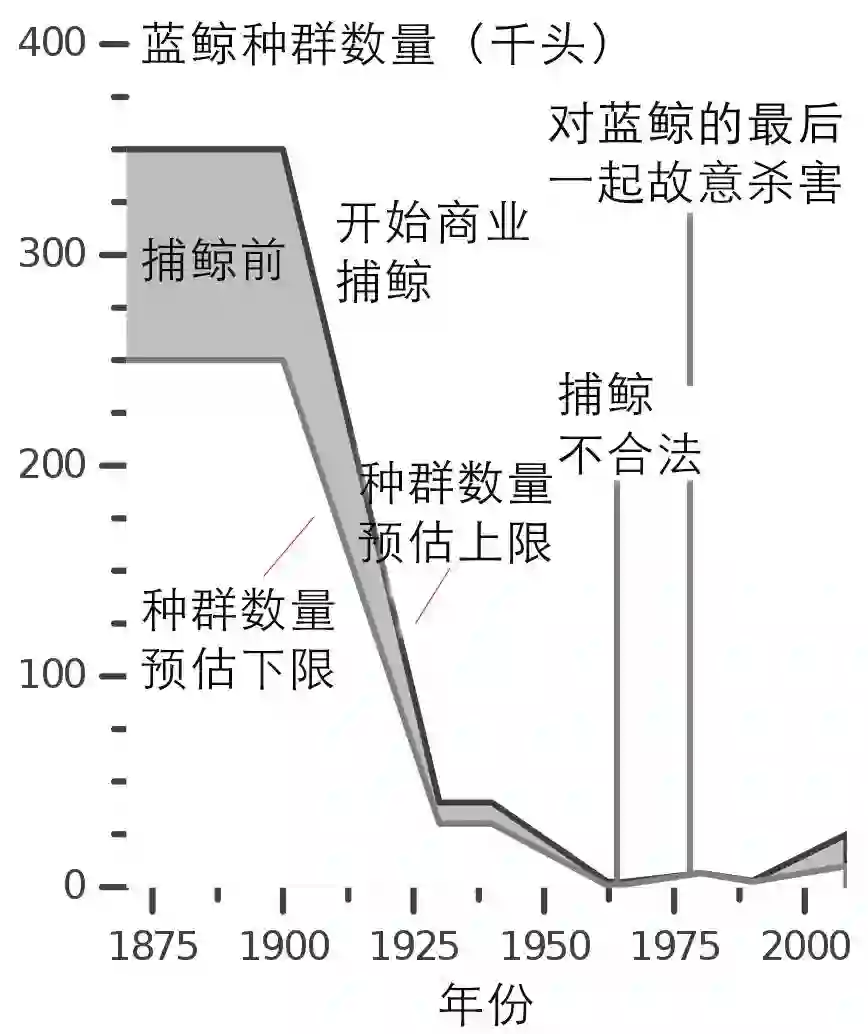 据统计,到20世纪70年代全球完全停止商业捕获蓝鲸为止,仅南极海域就有33万头蓝鲸被杀害,尤其是1930~1931年这一捕捞季,南极就失去了29400头蓝鲸。而与蓝鲸数量的历史高位相比,70年代的蓝鲸种群已经萎缩了99%。