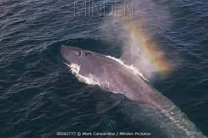 蓝鲸来到浅水换气,喷出的水柱形成一道小小的彩虹 | Mark Carwardine / mindenpictures