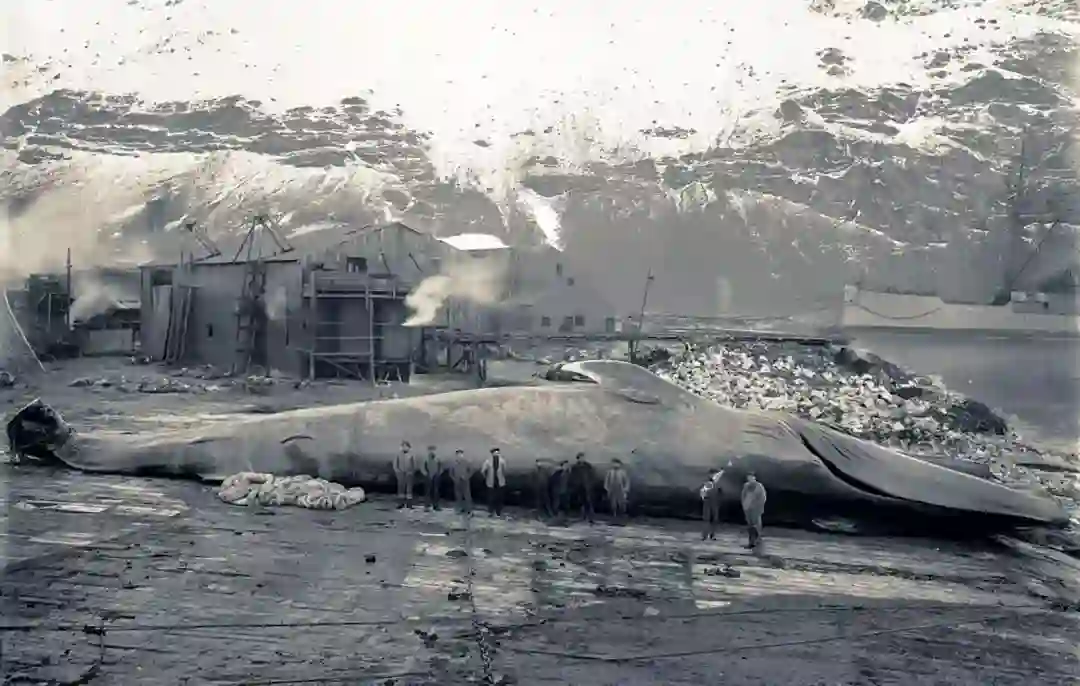 20世纪初,南极南佐治亚岛格瑞特威肯捕鲸站捕获的一头巨型蓝鲸 | nhm.ac.uk