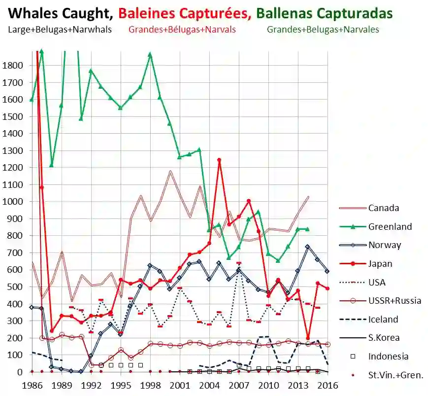 30年间,各捕鲸大国或地区逐年捕鲸数量(白鲸+独角鲸+其他大型鲸) | IWC