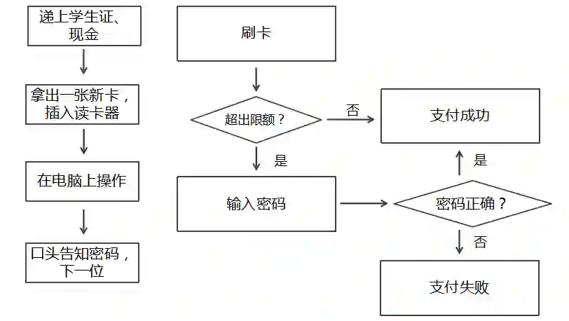 我们以北京某大学饭卡的办理和刷卡流程为例,下图为该产品逻辑: