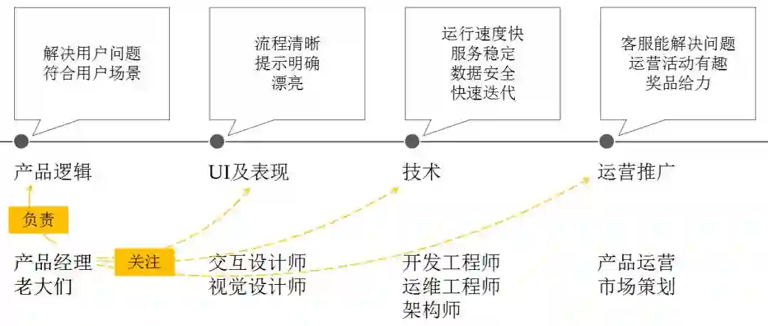 纵观这条线,我们会发现,只有2个角色是有可能覆盖到全局的,即产品经理和老大。但是领导一般都很忙,也通常不会关注细节,所以一般只有产品经理这个角色是会掌控产品全局的。所以我们若想把一个产品的用户体验做好,首先一定要从产品逻辑这个环节下手,其次除了要负责产品逻辑,也要关注其他所有维度。