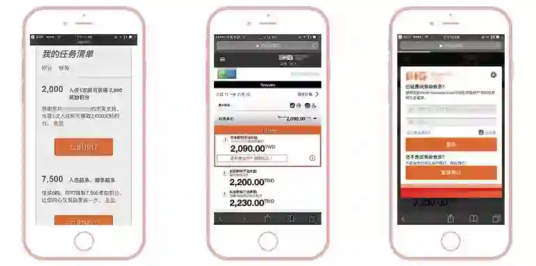 我输入了会员号、密码,点击登录,出现的页面是一个任务清单,即要求我完成任务获得积分。我选择了一个2000积分的任务,点击按钮“立即预订”,如上图左。接下来,进入到下一个页面,可以选择我能接受的房价。在这个页面中,能看到一个明显的颜色标记,表示下面的价格是“会员价格”,但是同时在价格下面还可以看到一排小字“还不是会员?即刻加入”,如上图中。咦,我早就是会员了啊,我当时就有一种不祥的预感。果然,在我点击了价格之后,又弹出一个页面让我再登陆一次,如上图右。