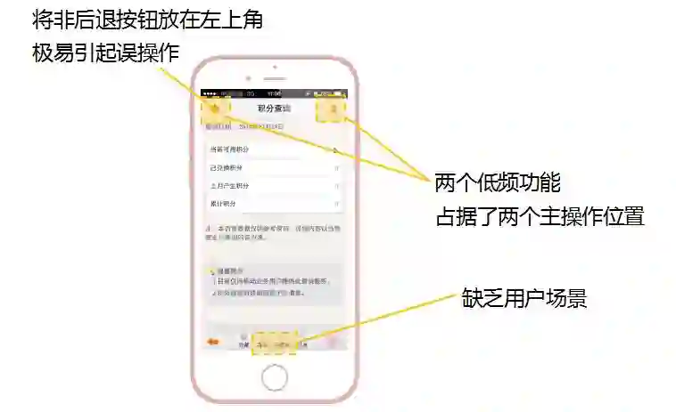 一般来说,在UI的右上角,我们会放一些全局性的操作,比如前进、发起聊天、收付款等按钮。但在这个APP中,右上角放的是“个人中心”入口。首先个人中心这个场景在积分查询这个功能页面中,有没有必要放在右上角,是值得探讨的;其次右上角一般会放前进类的操作,但个人中心更多代表的是返回类的操作。
