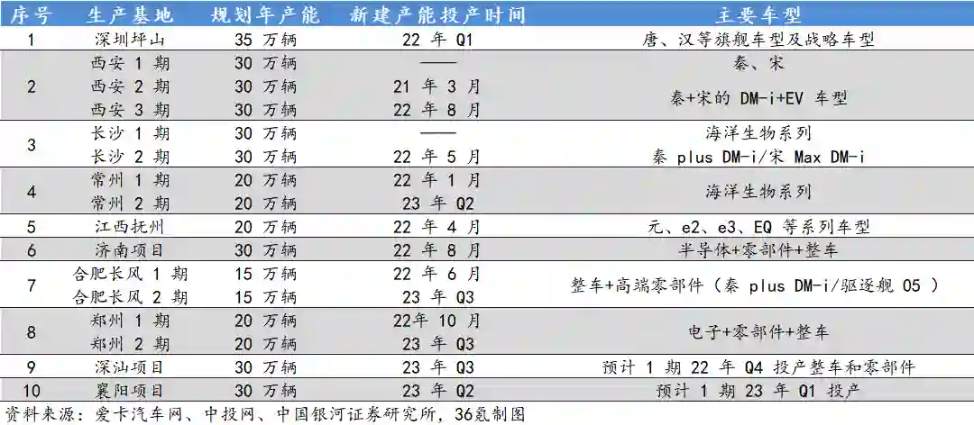 拆分来看,这10大分别位于深圳、西安、长沙、常州、抚州、济南、郑州、深汕、襄阳和合肥。其中,深圳坪山工厂为比亚迪汉+唐两款车型的生产基地,按照2021年的数据,月产能约为2-2.2万辆,全年原有产能为20万辆。不过,目前深圳基地正在扩产中,预计全年可以新增15万辆的规划产能,合计为35万辆;