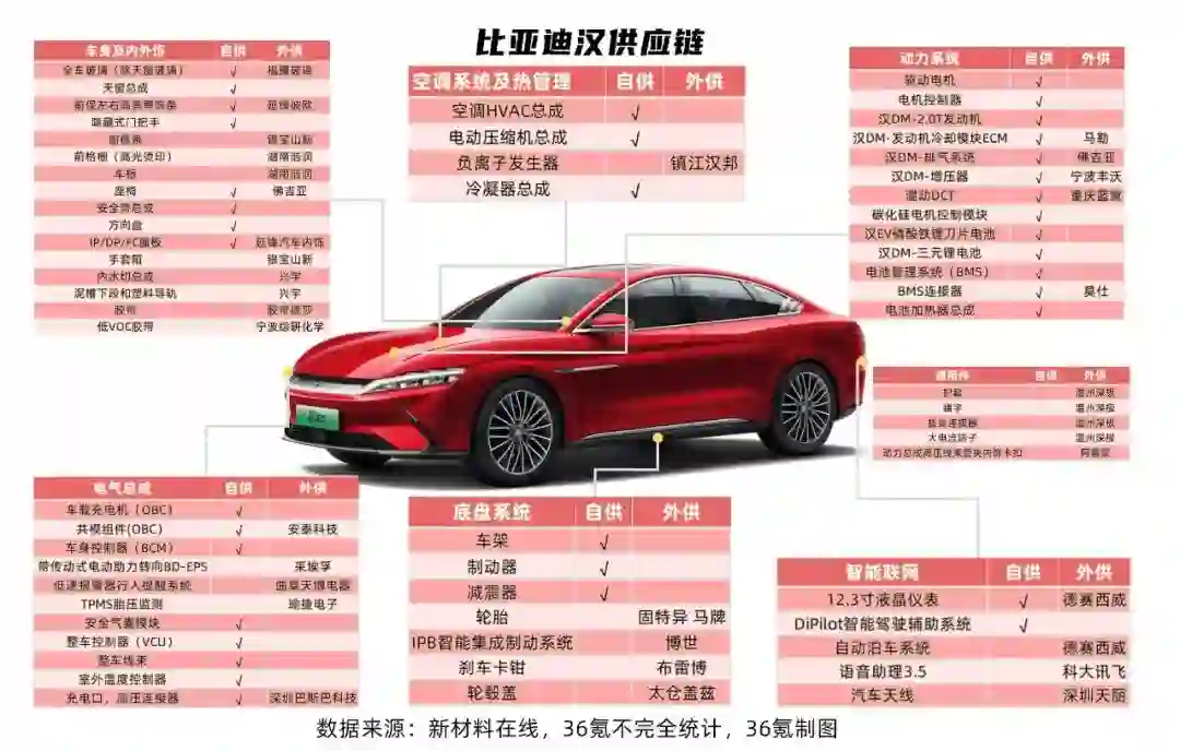 同时,也让我们看到了比亚迪的垂直供应链体系里,到底有多大程度可以实现自给?以搭载了刀片电池的比亚迪汉为例,我们对该车的产业链进行拆解。