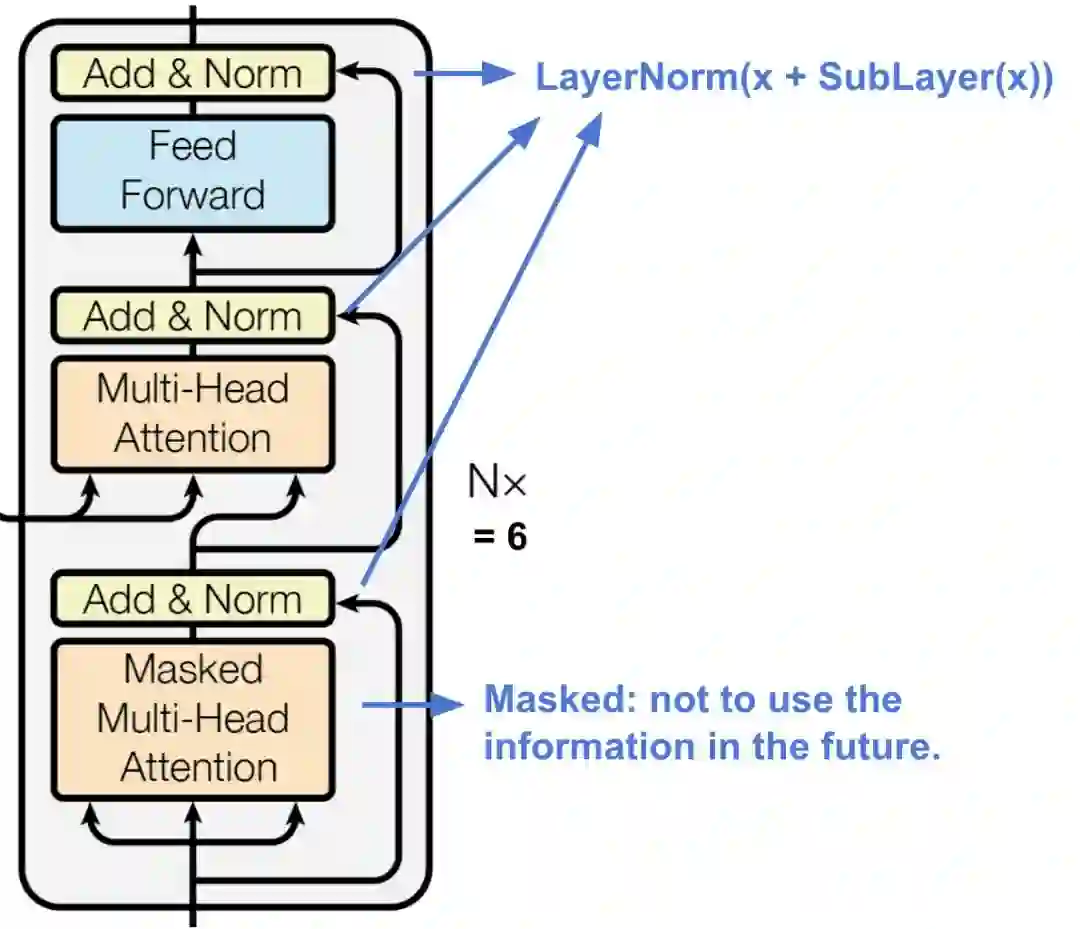 与编码器结构类似,每个解码器子层之间都采用残差连接方式,并且使用层归一化(layer normalization)。