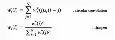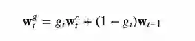 然后利用插值门,也就是一个标量gt将新生成的基于内容的注意向量与上一步的注意权值进行混合: