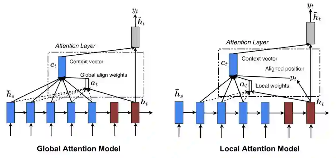 图8 全局和局部注意力机制(图片来自于Luong,et al.,2015中图2和图3)
