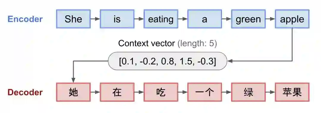 Encoder:编码器处理输入序列,然后将其中包含的信息压缩成固定长度的上下文向量(context vector),上下文向量也可以叫做句子嵌入(sentence embedding)。这种表示方式可以用来对一整个句子的含义做出一个很好的总结。
