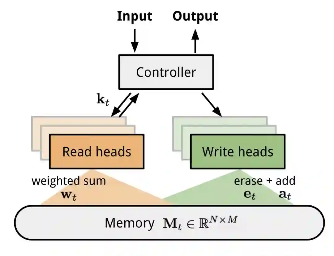 神经图灵机(NTM,Graves, Wayne & Danihelka, 2014)是一种神经网络与外部存储器耦合的模型结构。存储器模仿图灵机磁带,神经网络控制操作头从磁带读取或者向磁带中写。然而,NTM中的内存是有限的,因此它看起来更像是一台“神经冯诺伊曼机器”。