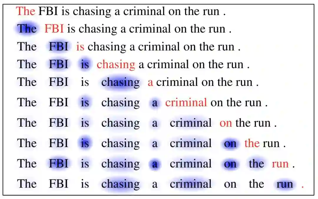 图6 当前单词为红色,蓝色阴影的大小表示激活级别也就是相关性的大小。(图片来自于Cheng et al.,2016)