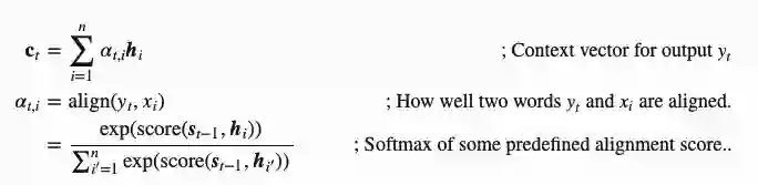 的集合衡量了输出关注到多少源序列的隐层状态。在Bahdanau的文章中,对齐分数