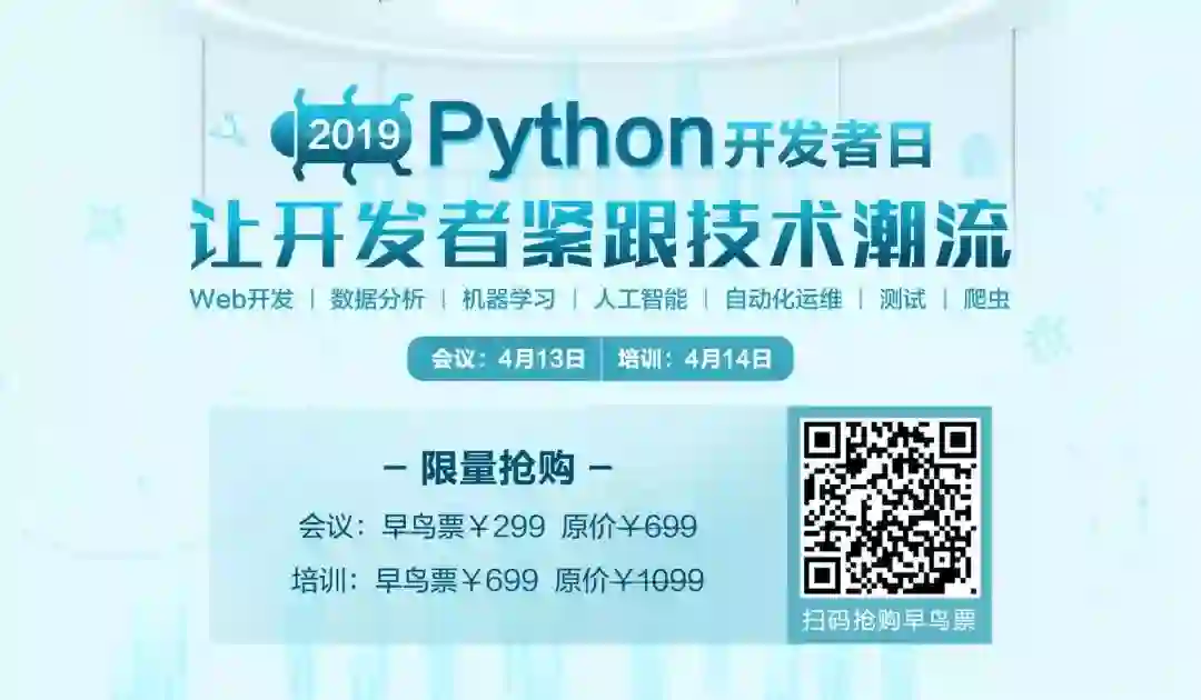 4月13-14日,CSDN将在北京主办“Python开发者日(2019)”,汇聚十余位来自阿里巴巴、IBM、英伟达等国内外一线科技公司的Python技术专家,还有数百位来自各行业领域的Python开发者,共同探讨Python在不同场景下的的应用优势和实战经验。即刻扫码抢购早鸟票,限量发售!