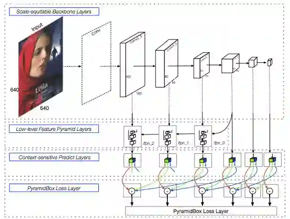 图 1:PyramidBox 架构。它包含 Scale-equitable 主层、低层级特征金字塔层 (LFPN)、语境敏感的预测层和 PyramidBox 损失层。