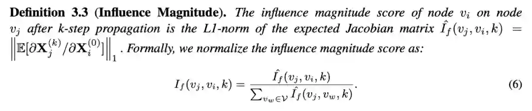 每个新标注的节点都会将其标签信息传播给 k 层图神经网络中的 k 跳邻居,并相应地影响这些节点的标签分布。由于节点对其不同邻居的影响可能是多种多样的,我们通过计算节点 i 的输入标签的变化对 k 步传播后节点 j 的传播标签的影响来衡量它,公式如下图: