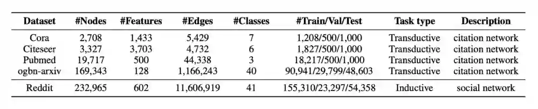 数据集使用了 3 个论文引用数据集:Cora、Citseer 和 PubMed。一个社区数据集 Reddit。一个 OGB 公开数据集 ogbn-arxiv,具体细节信息如表格所示。而对比的 baseline 里我们选择了 GRAIN [4] 和 ALG [5] 等最新的在图上做主动学习的方法。