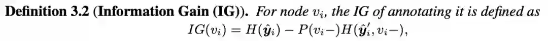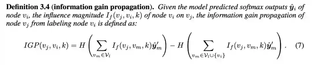 对于 k 层 GNN,一个节点的监督信号可以传播到其 k 跳邻域节点,然后影响这些邻域的标签分布。因此,在节点选择过程中只考虑节点自身的信息增益是不合适的。于是我们扩展了图 3 中定义的单个节点的信息增益到图中它的 k-hop 邻居,具体公式如下: