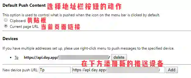 地址栏按钮:我们可以在插件的设置界面修改按钮动作,可以在网页链接和剪贴板内容之间选择一个进行推送。