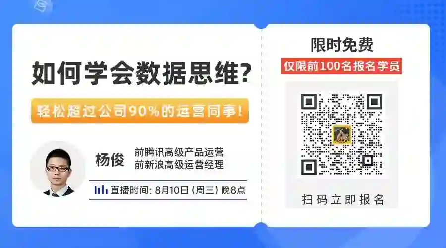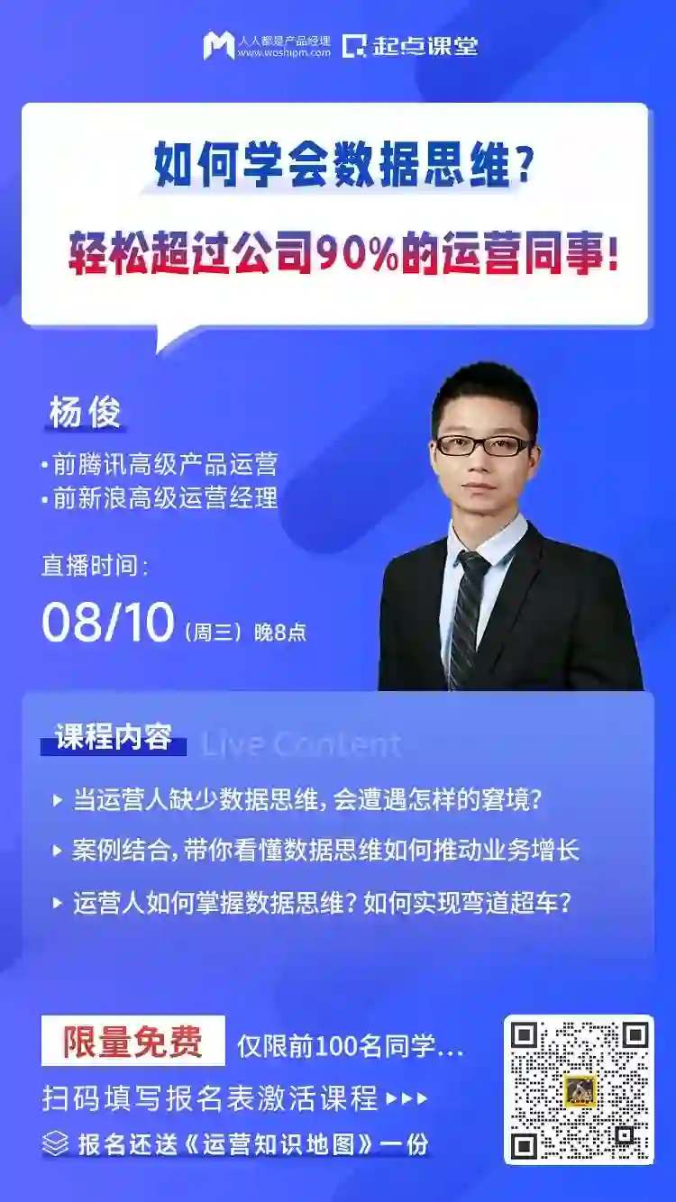 针对以上问题,我们特邀前腾讯高级产品运营、16年+运营资深大佬@杨俊老师,在8月10日(周三) 晚八点,为大家带来一场免费的直播分享课,用一小时教你培养思维,提升核心竞争力!