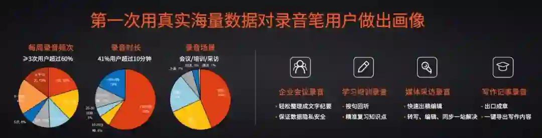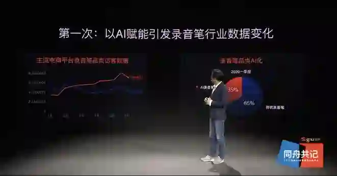 搜狗 AI 录音笔 E1 接下来是高效整理。结合使用场景,搜狗做了一些非常实用的功能点,让人印象深刻的是「敲重点」和智能摘要技术。 当你在听课或者参加会议时,突然听到一句神来之笔或者金句,「敲重点」就派上用场了。S1 有一个专用「M」键,按一下,它就会将这句话标记为重点。 面对一篇万字长文,如何能快速获取其关键信息。正是出于这种考虑,搜狗推出智能摘要功能,但其效果如何呢? 陈伟坦言,在 AI 录音笔中提取摘要,远大于学术研究中的摘要生成问题,因为录音笔是在噪声环境下,语音识别难以保证 100% 的准确率,从噪音文本中整理出符合文章语意的摘要是相当困难的。 因此在技术路线上,搜狗没有使用生成模型,而是采用抽取式的摘要能力,基于原文找到关键词,再通过排序算法,从文章中抽取关键句,形成摘要,保证足够的精度。 此外,AI 录音笔 S1 还能支持 5 人内的人声分离,从而在文稿中自动分段呈现。考虑到掌声、笑声、点赞等节点可能会出现一些重点或金句,它还会自动识别并重点标记。 除了录音笔所需要的服务外,搜狗还将 AI 翻译能力内嵌其中。 目前搜狗 AI 录音笔 S1 支持 63 个语种的在线翻译,9 种离线翻译。在对话过程中,S1 还具备自由对话功能,能够自动识别说话人是否讲完,进而呈现翻译结果,无需手动操作。 此外,它还具备同声传译功能,你可以带着它听英文演讲、报告,屏幕上就会同步翻译中文字幕。 种种服务背后,正如搜狗 CTO 杨洪涛所言,AI 录音笔是为了让人们更自由的表达,而这背后所用到的技术,相当多是对搜狗原有技术体系的复用,并针对硬件做更好的 AI 优化。 03、AI 加持,行业呈现「新蓝海」 与搜狗 AI 录音笔迭代一同上演的是,录音笔行业的洗牌与变革。 录音笔是一个相对狭小的传统市场,过去 20 年间没有太多变化,随着智能手机集成功能的持续丰富,它面临被手机替代的风险。 因此我国录音笔每年销量在 400 多万台徘徊,增长基本停滞,市场多被索尼、爱国者、纽曼等硬件厂商占据。 随着搜狗 AI 录音笔 C1 推出,市场格局开始出现变化。2019 年 6 月,它便成为京东录音笔类目单品销量冠军、天猫录音笔类目单品销售额冠军,随后 11 月又拿下天猫京东双平台单品总销量冠军。 更为重要的是,AI 录音笔的出现,在主流电商平台上,让原本趋于平缓甚至下滑的录音笔品类访客数据明显上升,既有的市场天花板正在被打破,行业呈现「新蓝海」。
