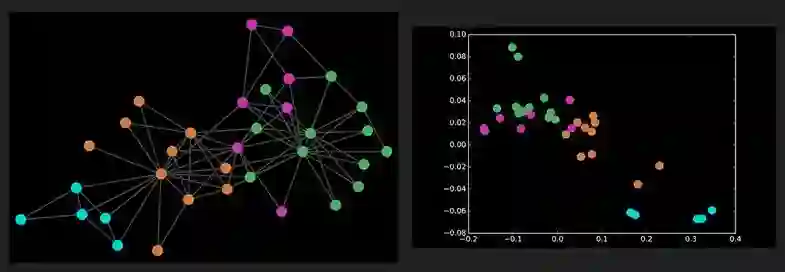 对图网络进行卷积之后,我们很意外的发现,图网络竟然在完全随机化的初始条件下,完成了在表征空间下的标签聚类。实际上,这正是因为图卷积操作就是在捕获图网络上的邻域信息,而邻域信息也被包含于节点和连边的数值中。在经过非线性映射之后,我们可以将其理解为对各种特征进行强化和分散处理,使特征更为明显,从而更好地完成聚类。
