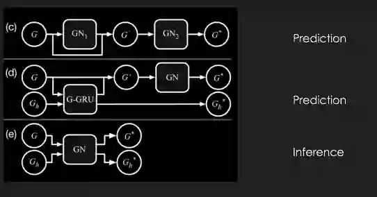 怎样进行更高层的信息整合呢?在基本的图网络构建完成之后,我们可以在高层次对信息进行处理来完成更复杂的任务。例如,我们可以将多个图网络叠加在一起(每一个图网络都是同构的,但它们表征的信息并不同),这样我们就可以构建出多层的图网络,从而拟合复杂的运算过程。我们也可以将不同时间的图网络状态放入RNN架构中,从而完成对网络状态的预测,甚至我们可以将网络的输出作为自己的输入,进行后续状态的预测和生成。