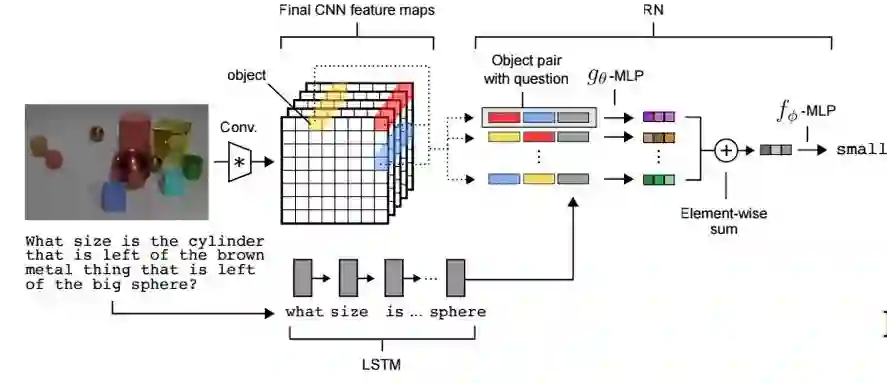 在这个问题中,我们可以让Relation Network去将任意两个Object两两组合,形成联结对,再与问题的编码相结合,通过线性映射形成对问题和答案的表示,最终再映射为对问题的解答。选择问题答案的时候,我们同样可以将每个答案和问题去拼接,通过是否有关的映射之后再映射为最终答案。