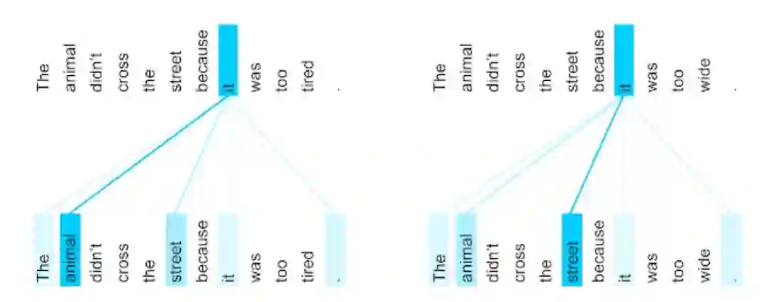 因此,Self attention可以突破窗口大小的限制,完成很多长程连接上的信息提取,例如可以用self attention解决前文提到的指代消解问题:在self attention结构进行运算时,我们可以看到it在不同的语境下,关注到了不同的实体。