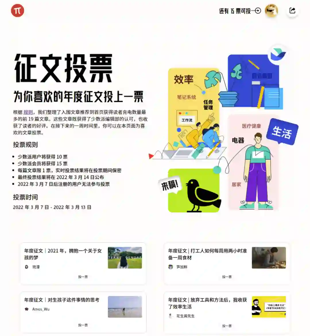 每位 2022 年 3 月 7 日前开通会员的少数派用户将 15 票