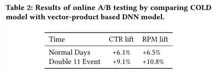 COLD 的训练和在线打分都是实时的,可以更好的适用数据分布的变化。2019 年以来,COLD 已经在阿里定向广告的各主要业务上得到广泛应用并取得了显著的效果提升。