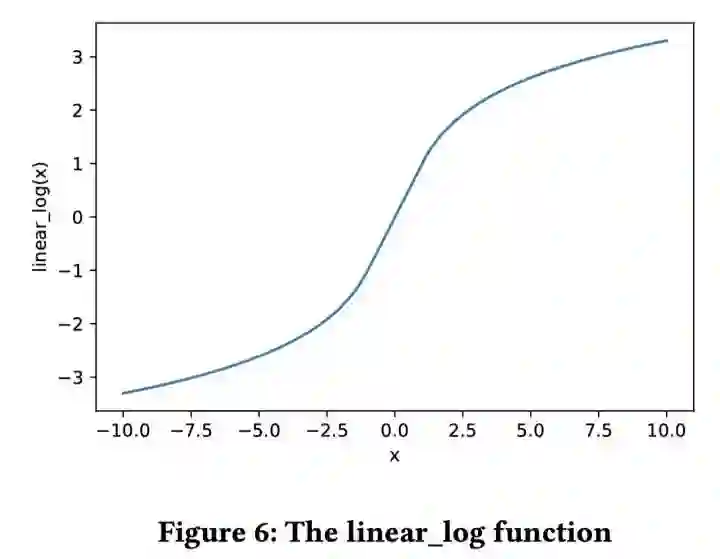 另一种方式是使用参数无关的归一化方式,例如 log 函数。但是 log 函数不能处理负数,并且输入值接近 0 的时候会输出绝对值较大的数字。因此我们设计了一种分段平滑函数,我们叫做 linear-log 来解决这个问题: