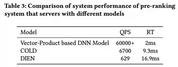 从 Table 3 可以看到,向量内积模型的系统性能最好,而精排的 DIEN 的系统性能最差,COLD 则在两者之间取得了平衡。