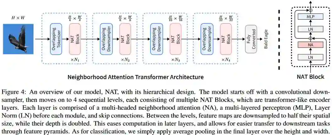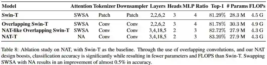 NAT中,在下采样特征图和Stem阶段都使用的是重叠的跨步卷积操作。这不同于Swin。虽然可能引入更多的计算和参数,但是通过模型整体的配置,是可以得到更少计算量的结构的。