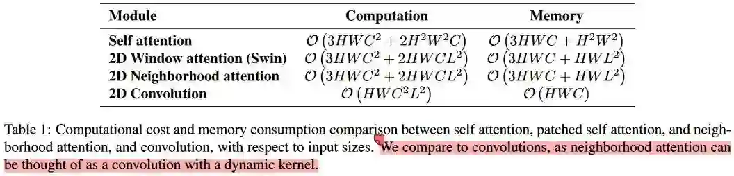 文章对比了标准卷积、窗口注意力、文章提出的NA,以及标准的自注意力的计算和内存占用。卷积本身在内存占用上有着明显的优势,而且与窗口大小无关。而在计算量上,卷积与通道数量和方形窗口边长都呈二次关系。通过仔细对比二者的公式可知,在常用的通道和窗口配置下(例如L=3,C>3时),提出的NA在计算量上是可以小于标准卷积操作的。只是会有更多的内存占用。