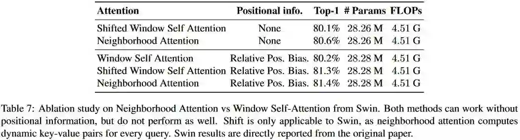 NA和SASA之间的一个关键的差异在于邻域的定义不同。 NA是基于每个像素去和其最近的邻域交互,而SASA则是仍然延续“same”形式的卷积,是基于每个像素仅和其周围的像素发生关联的形式。这两种定义形式在边缘部分是非常不同的,并且边缘会随着窗口大小而增长。(可以看论文的图6或者前面那个动图。)另外,不论是SASA或是HaloNet都没有开源,并且很难直接比较。而且在HaloNet的表1中,似乎暗示着SASA甚至有着和NA不同的计算复杂度和内存使用。因此可能有其他我们不知道的差异存在。 另一个大的差异是NA和SASA的应用形式不同。 SASA目的是替换显存模型中的空间卷积操作,像是具有较小的内核大小的 ResNets。而我们的想法是去使用具有大邻域的NA来构建有效的分层Transformer,其在图像分类和其他的下游视觉应用中工作的很好,类似于Swin做的那样。这就是为什么我们的相关部分没有关注 SASA 和 HaloNet 等工作的原因,因为虽然它们的注意力机制有相似之处,但论文的重点和应用却大不相同。我们的 NAT 直接与现有的最先进的分层模型(例如 Swin)竞争。