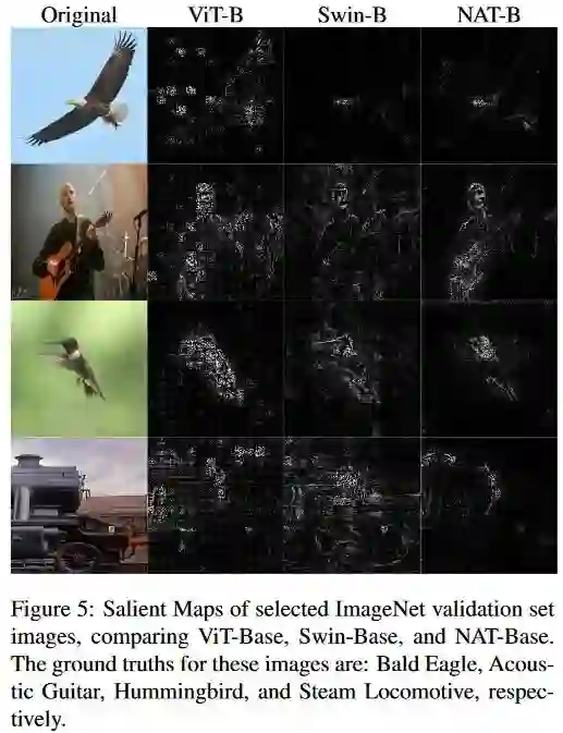 在可视化部分,作者们可视化了部分验证集数据的Salient Map。可以看到图中对于目标边缘的反应比较清晰。这可能是因为提出的NA良好的局部偏置特性以及卷积Tokenizer和Downsampler带来的。也就是说,够强的局部偏置带来的效果。