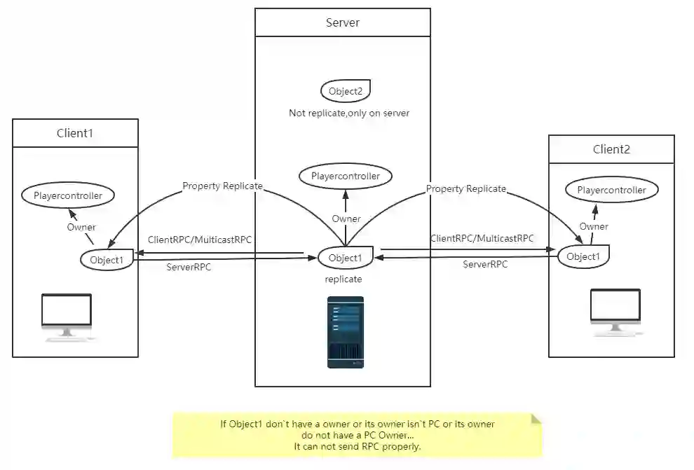无论是RPC,还是属性同步,你会发现他都是基于UObject的,或者更确切的讲都是基于Actor的(以及其附属组件)。因为这两种功能一个是利用类中的函数,另一个是利用类对象的属性,他们都需要与某一个具体的对象作为媒介,而在UE的架构中,设计都是面向对象的,每个Actor都可以理解为游戏世界的对象。