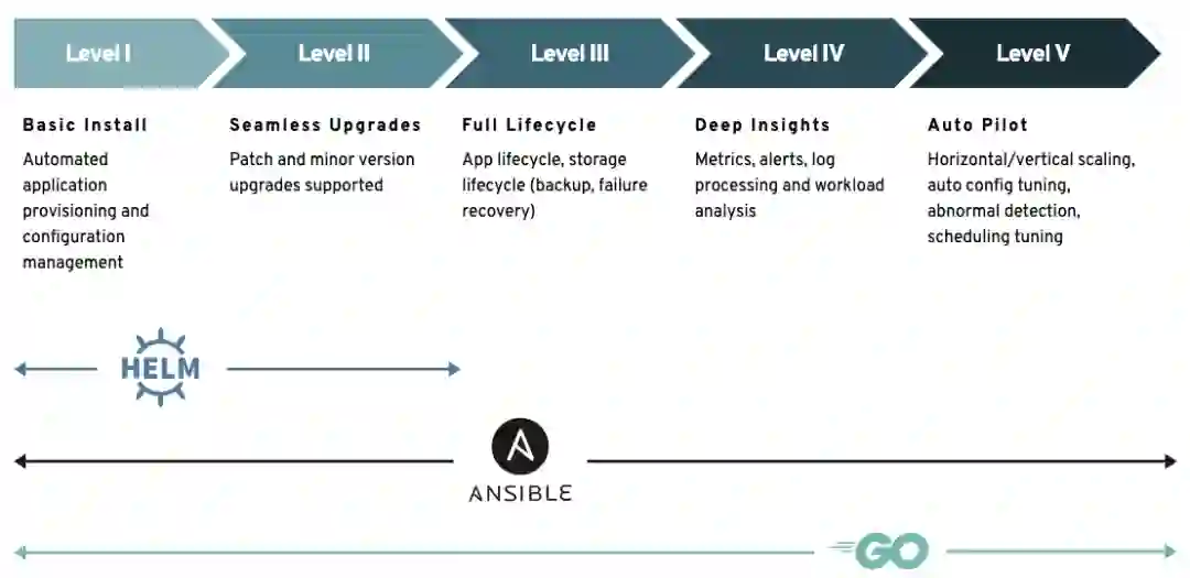 如图所示,Helm 最适合 Operator 前两个级别的功能,侧重于简单的安装和升级。执行更复杂的操作如故障处理和恢复、自动伸缩,以及更复杂的安装和升级应该用诸如 Ansible 或 Go 之类的编程语言来实现,而不是使用像 Helm 这样的模板语言。