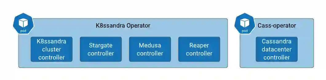 虽然 Reaper Operator、Medusa Operator 和 Stargate Operator 有单独的仓库,但我们计划将它们合并到 K8ssandra Operator 中。K8ssandra Operator 将在单个 pod 中运行,但将包含与每个 CRD 对应的多个控制器。我们将会有多个 CRD 和多个控制器。因为 cass operator 已经被独立使用,所以它仍将是独立的,并将成为 K8ssandra Operator 的一个依赖项。