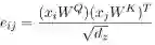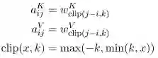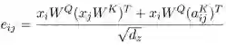 输入元素xi,xj之间的边由a_ij^V 和a_ij^K 表示,学习两种不同的边缘表示的动机是a_ij^V 和a_ij^K分别适合方程3和4使用。不需要额外的线性变换。这些表示可以在attention head之间共享。