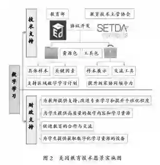 2016年10月,美国教育部又发布了《“学生支持和学业提升”资助计划》(Student Support and Academic Enrichment Grant)的非管理性原则,重点指出使用这一资助计划用于有效提升使用技术的五个方面:①为教育工作者、学校领导和管理者提供高质量的专业发展,以促进学习的个性化和成绩的提高;②建设基础设施,提升技术能力;③实施创新混合式学习项目;④为农村偏远地区提供资源,使其能够获得高质量的数字学习机会;⑤利用技术(数字学习技术和辅助技术)的优势,提供专业规范的学习课程。这一教育技术愿景的实施,如图2所示。